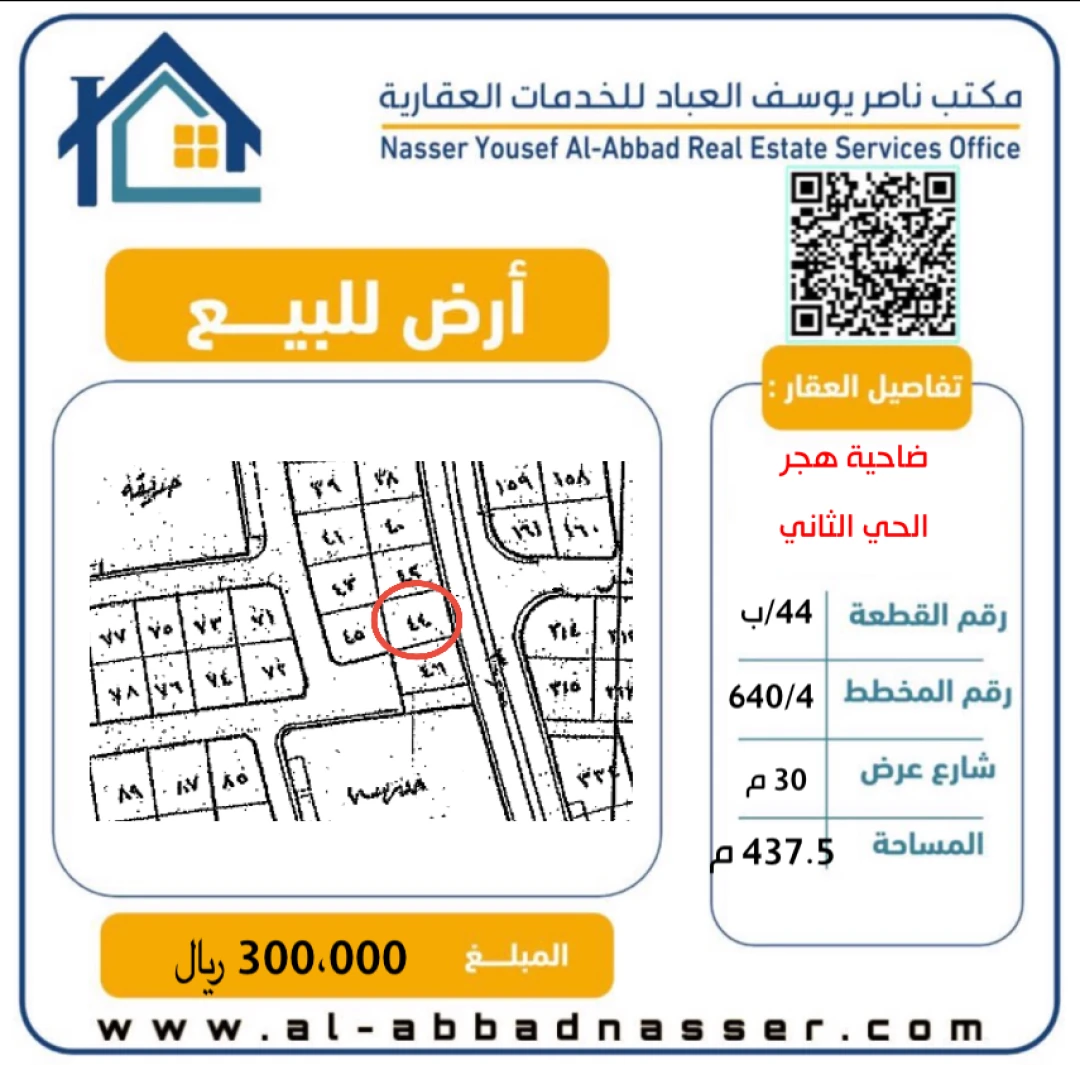 ضاحية هجر - حي الثاني رقم الارض / 44/ب حدود الارض … شارع عرض :- 30 متر مجموع مساحتها في الصك/ 437.5 متر السـعـر :- /290،000 ﷼ ▫️غيــر شــامل الضــريبة والسعــي
