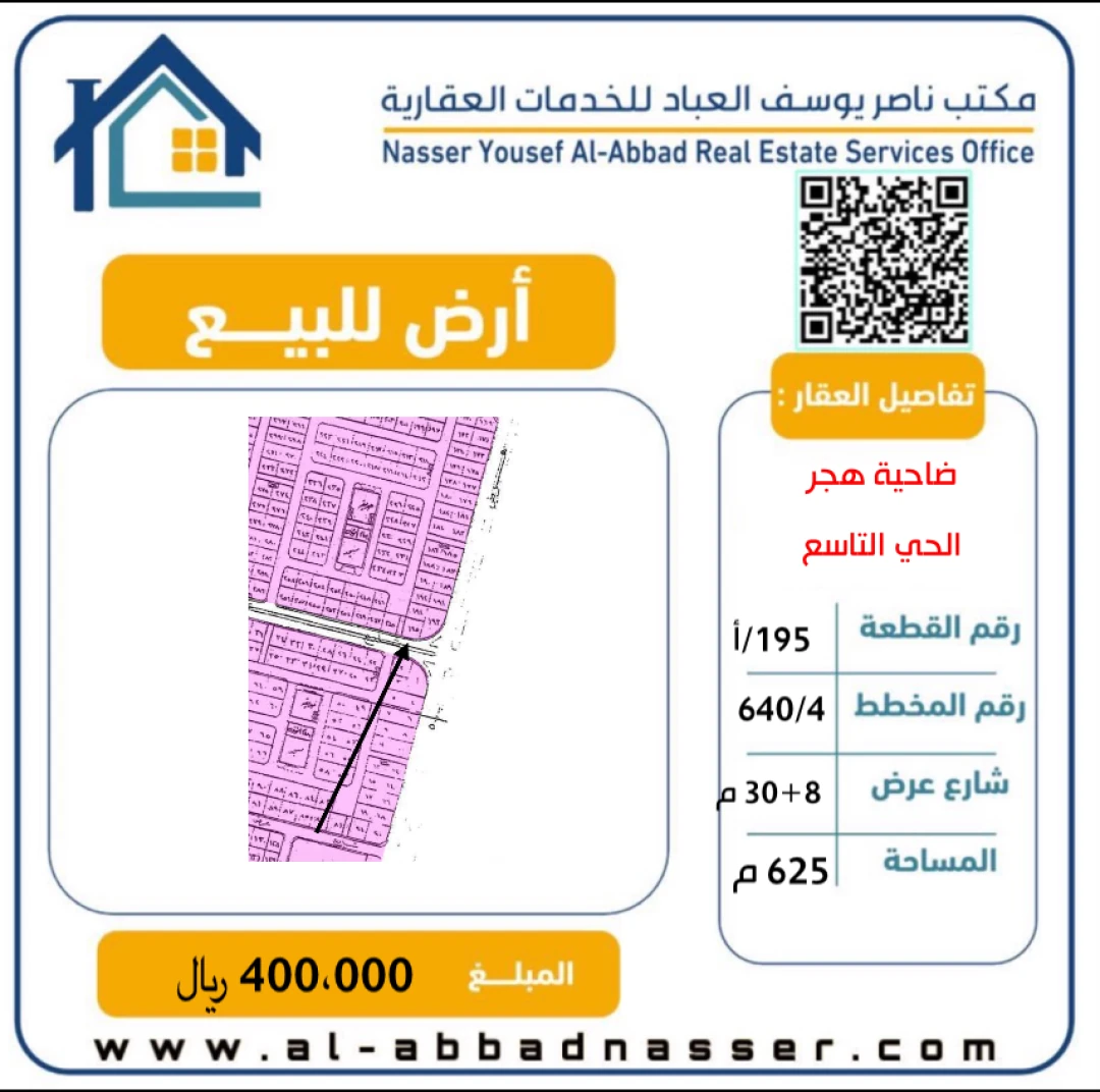 ضاحية هجر - حي التاسع رقم الارض / 195/أ حدود الارض … شارع عرض :- 30 متر نافذ عرض :- 8 متر الاتجاهات:- جنوب غرب مجموع مساحتها في الصك/ 625 متر المساحة بعد الإضافة:- 900 متر السـعـر :- /400،000 ﷼ ▫️غيــر شــامل الضــريبة والسعــي